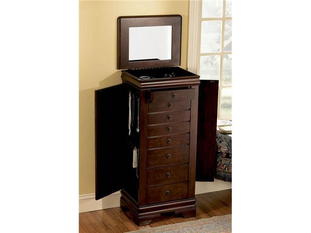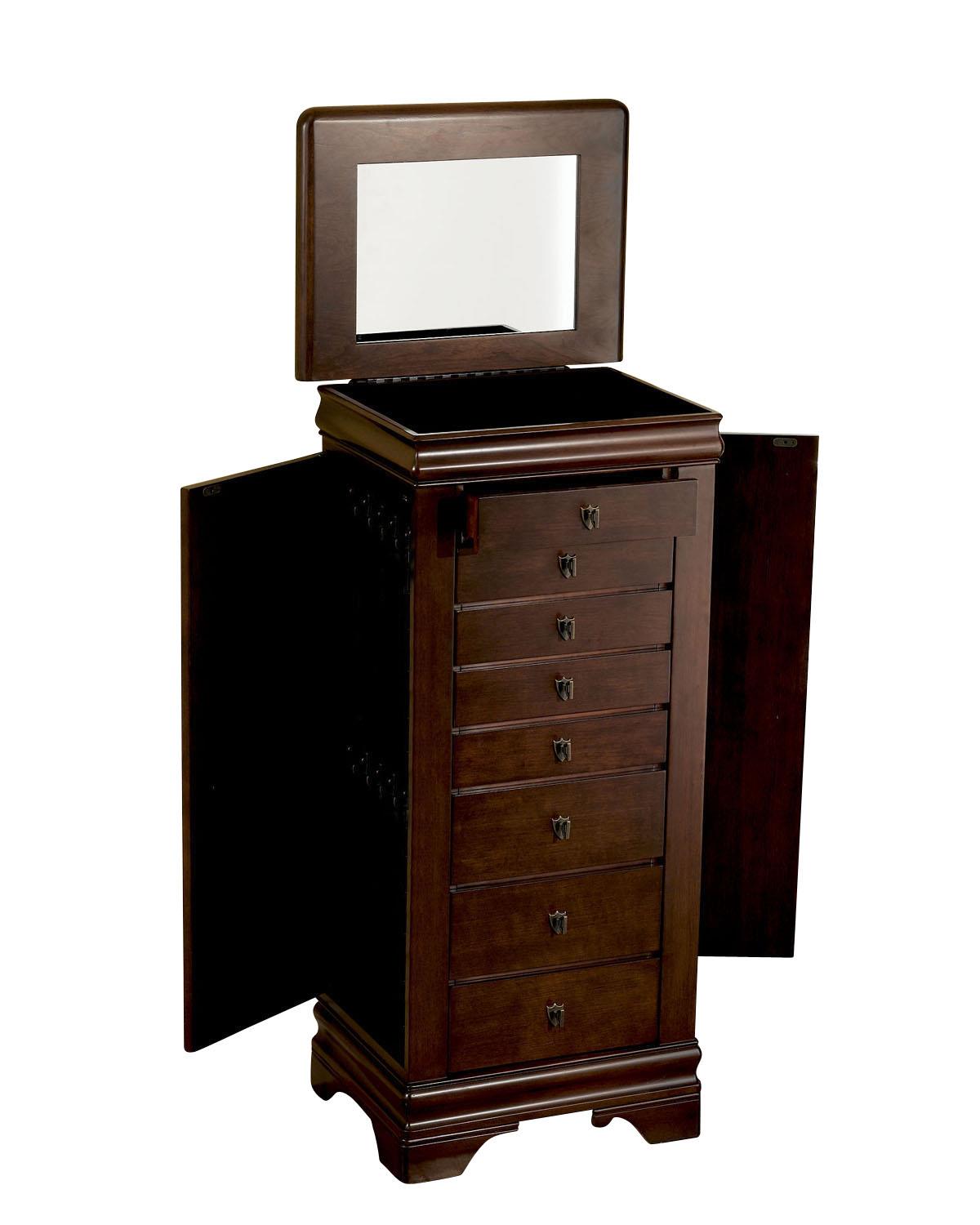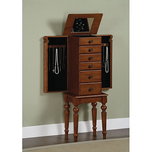 Powell jewelry armoire in woodland cherry six spacious drawers a deep flip top storage space and two side storage cabinets concealed with doors provides ample storage for all of your bits and baubles. Classically shaped freestanding jewelry armoire features cherry veneer with classic cherry finish. A mirror with vanity style lighting is a great addition.