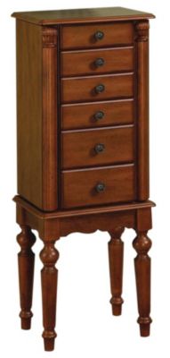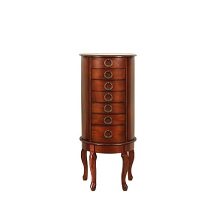 The powell woodland cherry round jewelry armoire provides all the storage needs for your precious jewelry pieces. Graceful turned legs and open circular knobs accent the piece. Mirrors many jewelry armoires are designed with a built in mirror making it easy to select just the right piece.